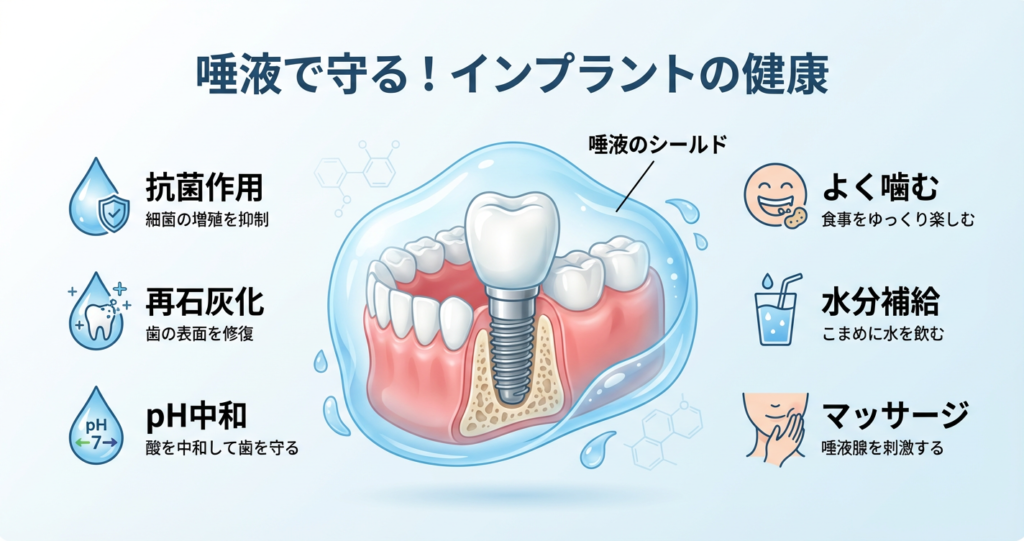 天然の歯はもちろんのこと、インプラントにとっても唾液は大切な存在です。とりわけインプラント周囲の健康を保つうえで、唾液の量と質は見逃せないポイントです。